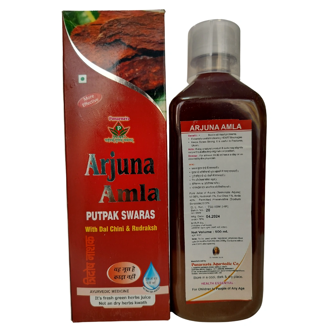 अर्जुन अमला पुटपाक स्वरस जुस ५०० मि.ली. एक प्रभावकारी आयुर्वेदिक रस हो, जसलाई अर्जुन (टर्मिनालिया अर्जुना) र अमला (धात्री) बाट पारम्परिक पुटपाक विधि अनुसार तयार गरिएको हुन्छ। यसले मुटु स्वास्थ्यको संरक्षण, रक्तनलीको मजबूती, र रोगप्रतिरोधात्मक क्षमता वृद्धि गर्न विशेष सहयोग पुर्याउँछ। साथै, पाचन शक्ति सुधार, कोलेस्ट्रोल सन्तुलनमा राख्न र सम्पूर्ण शरीरलाई पुनर्जीवित गर्न उपयोगी मानिन्छ।
