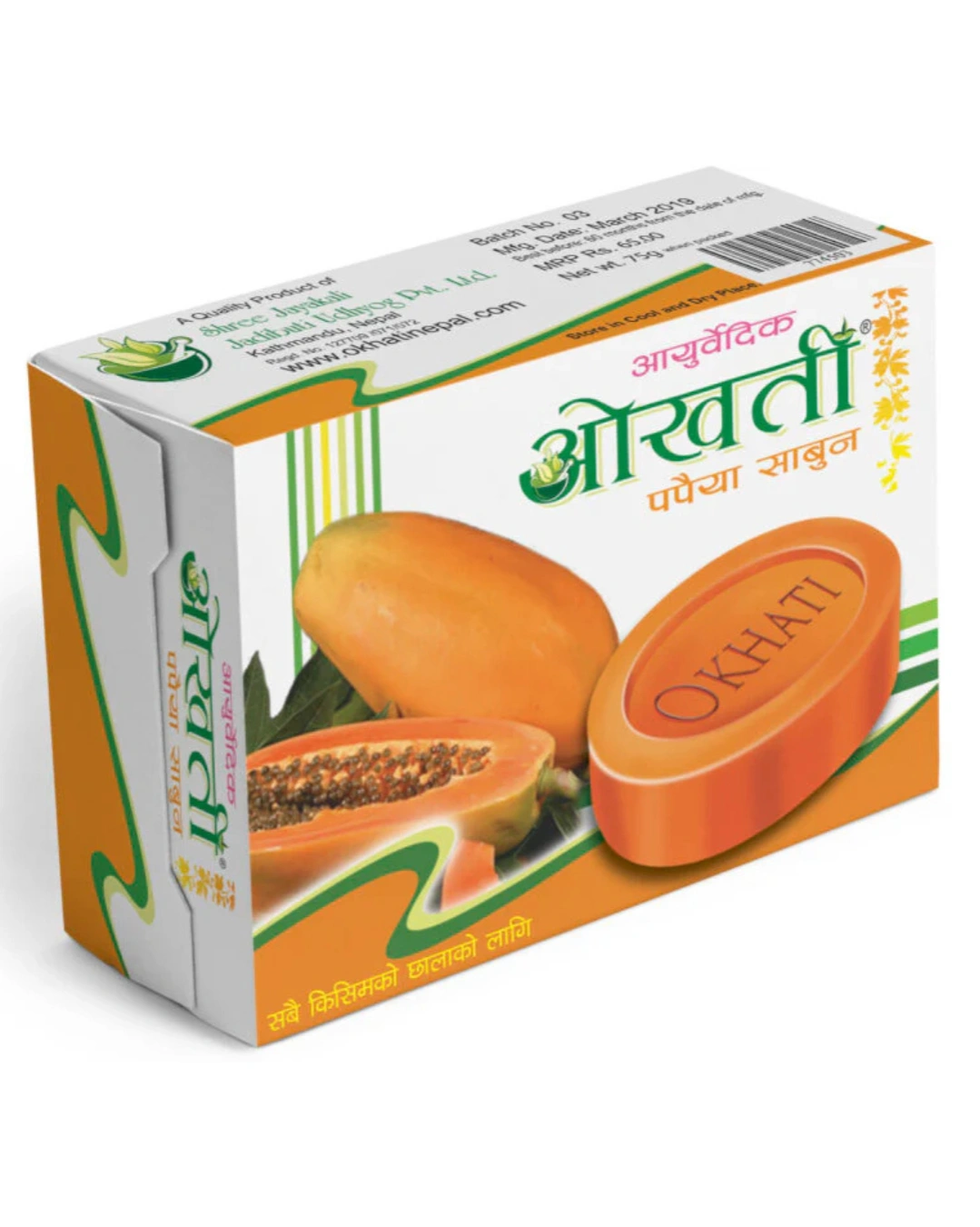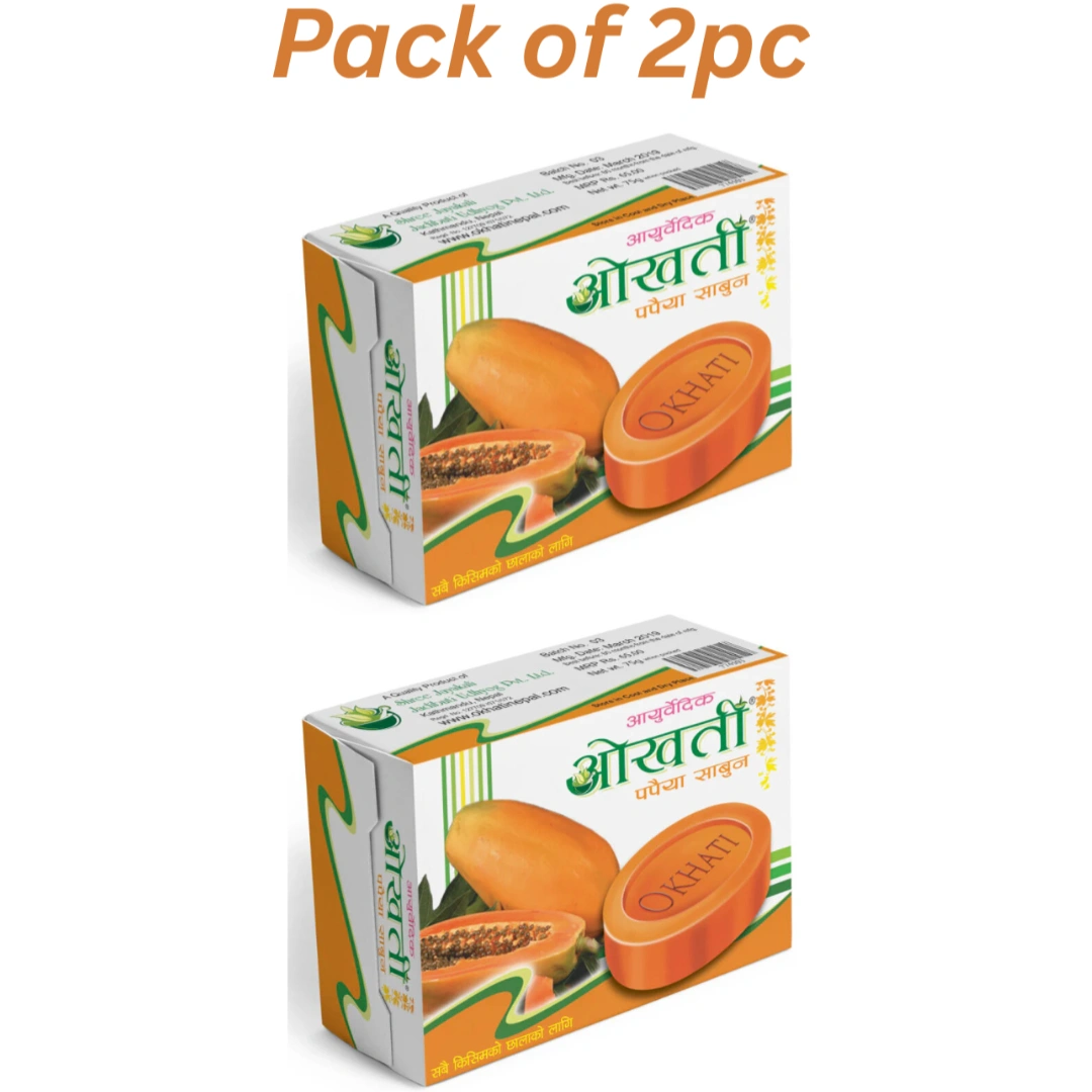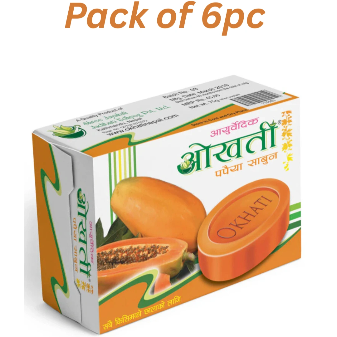 Embrace the healing power of Ayurveda with Okhati Ayurvedic Papaya Soap, now available at Nirogya Nepal. This 75g bar is a concentrated blend of pure Papaya extract and traditional Ayurvedic herbs. Designed to promote a clearer and more refined skin texture, it works by gently dissolving dead skin cells and clearing clogged pores. Whether you are dealing with uneven skin tone, minor blemishes, or dullness, this soap provides a natural, chemical-conscious way to achieve a healthy and glowing complexion