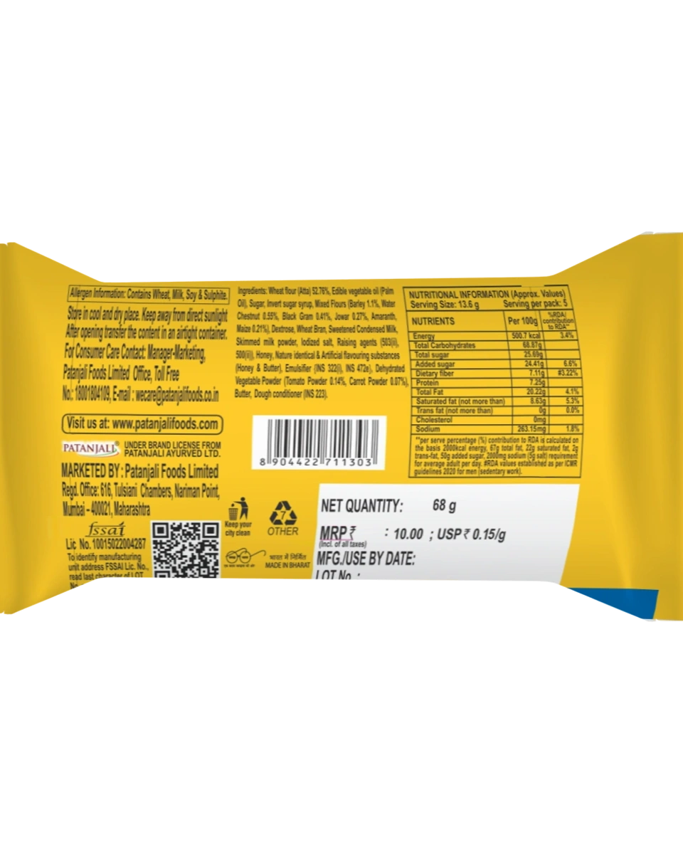 Elevate your snacking experience with Patanjali Aarogya Multi Grain Biscuits, now available at Nirogya Nepal. Specially crafted for those who don't want to compromise on health for taste, these biscuits are a powerhouse of nutrition. Made from a unique blend of multiple healthy grains like Wheat, Oats, Corn, and Gram, they provide a balanced mix of fiber, proteins, and essential nutrients. Unlike ordinary biscuits, these are designed to keep you feeling full and energized throughout the day. Perfect for weight watchers, fitness enthusiasts, and families, these biscuits offer a crunchy, flavorful, and guilt-free way to snack.