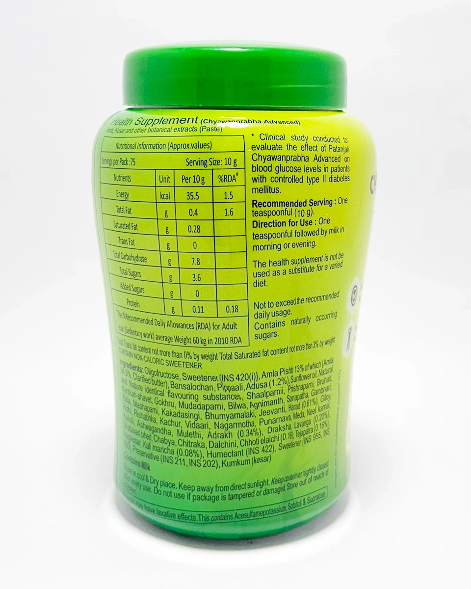 Experience the ultimate immunity booster without the worry of calories or sugar spikes with Patanjali Chyawaprabha Advanced, now available at Nirogya Nepal. This is a premium, No Added Sugar version of the traditional Chyawanprash, specifically formulated for health-conscious individuals, fitness enthusiasts, and those managing blood sugar levels. Packed with the power of over 40 potent Ayurvedic herbs and enriched with Saffron (Kesar) and Silver Leaves (Rajat Bhasma), it offers advanced protection and rejuvenation while maintaining a delicious, guilt-free taste.