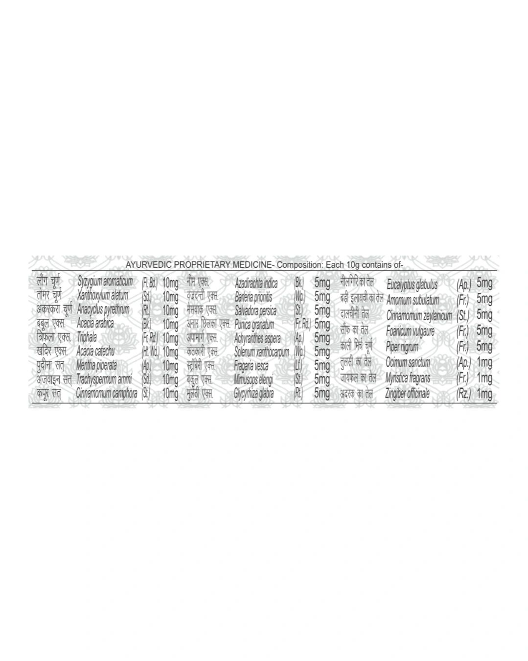 २६ जडीबुटीको शक्ति: टिमुर, अकरकरा, निम र बबुल जस्ता २६ शक्तिशाली जडीबुटीहरूको सम्मिश्रणले दाँतलाई चौतर्फी सुरक्षा दिन्छ।