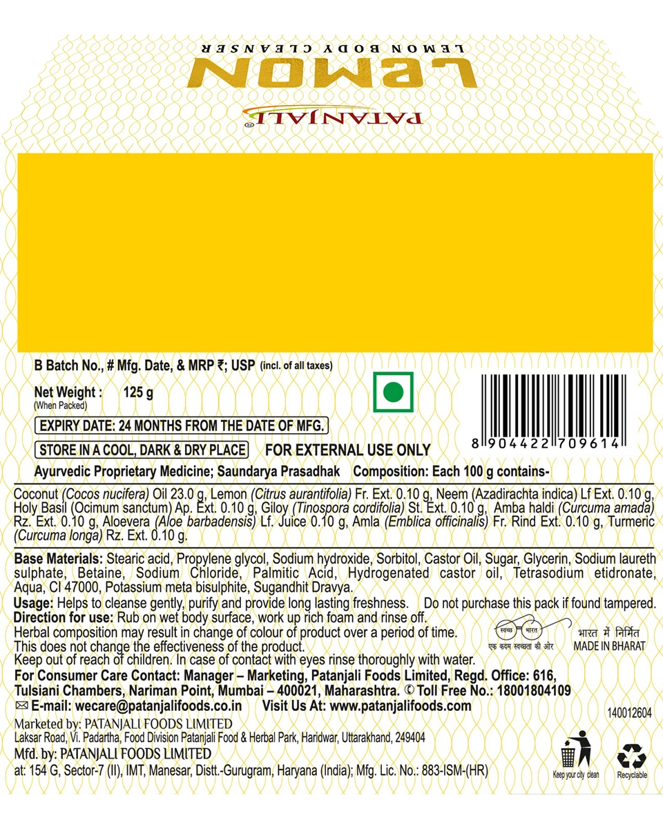 Experience the ultimate burst of citrus freshness with the Patanjali Lemon Body Cleanser Family Pack, now available at Nirogya Nepal. This value bundle contains four 125g bars, providing an economical and refreshing solution for your entire household's daily hygiene. Infused with the natural goodness of Lemon (Nimbu), this cleanser is specifically designed to rejuvenate the skin, remove excess oil, and provide a deep sense of cleanliness that lasts all day.