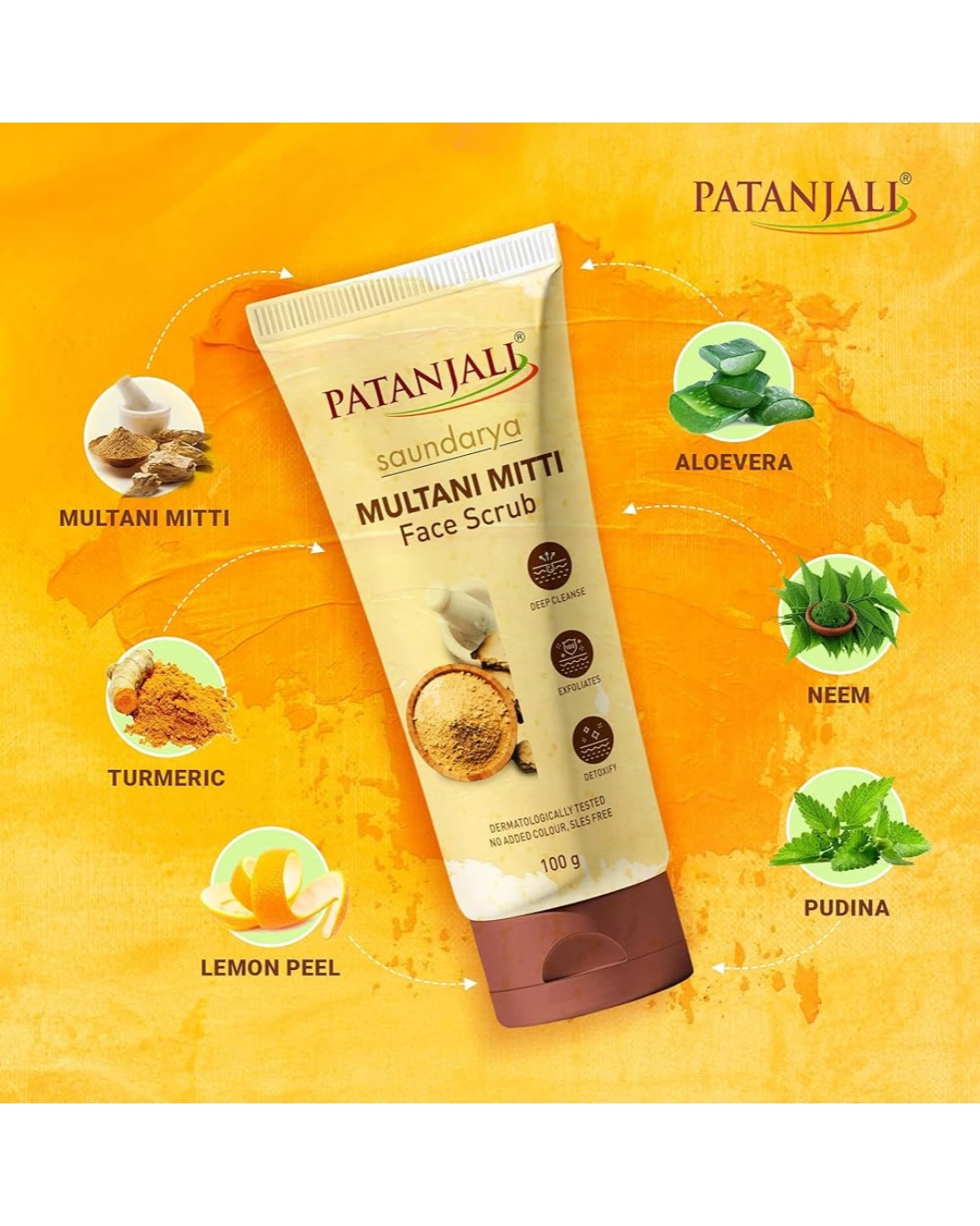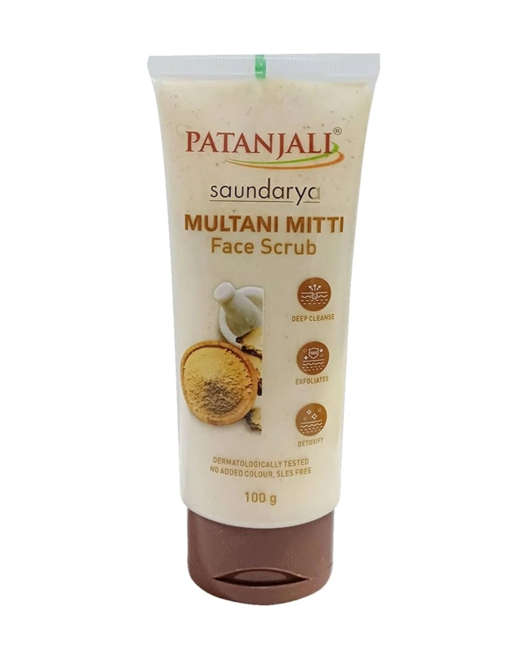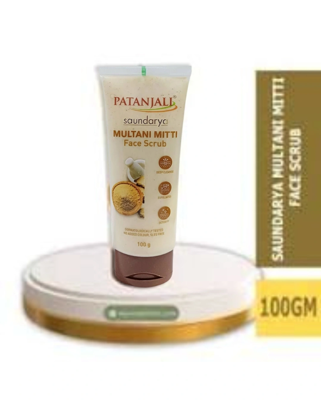 Revive your skin’s natural radiance with Patanjali Saundarya Multani Mitti Face Scrub, now available at Nirogya Nepal. This 100g scrub combines the age-old wisdom of Multani Mitti (Fuller's Earth) with modern skincare science. Enriched with herbal extracts like Neem, Aloe Vera, and Turmeric, it is specifically designed to deep-cleanse pores, remove stubborn blackheads, and lift away dead skin cells, leaving your face feeling incredibly smooth and refreshed.