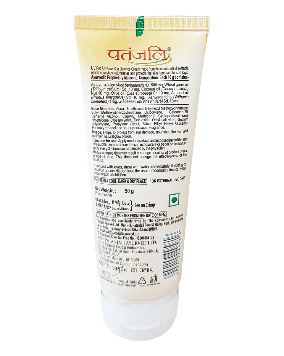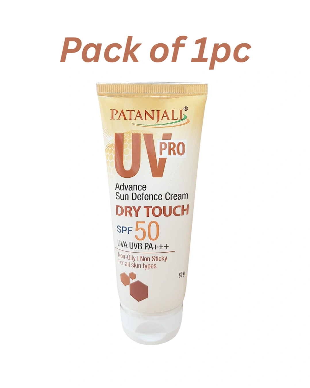 Shield your skin with high-performance protection using Patanjali UV Pro Advance Sun Defence Cream, now available at Nirogya Nepal. This advanced 50g formula offers a superior SPF-50 rating, specifically designed for those who spend significant time outdoors or have skin sensitive to the sun. Infused with natural extracts like Aloe Vera, Fenugreek (Methi), and Calamine, it provides a unique "Dry Touch" finish that keeps you protected without the unwanted shine.