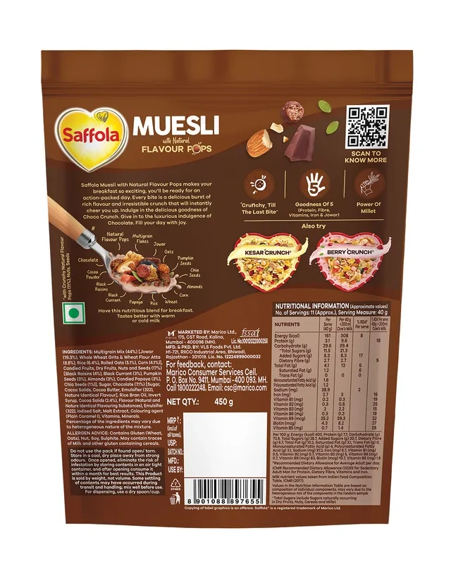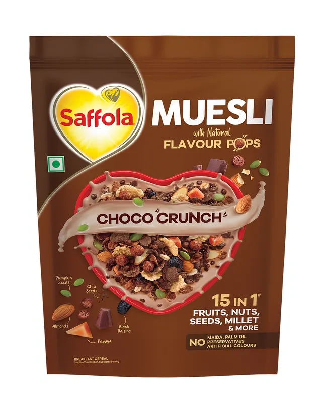 Start your morning with a burst of flavor and nutrition with Saffola Muesli Choco Crunch, now available at Nirogya Nepal. This 400g pack offers a delightful crunch with the goodness of five high-fiber grains: Oats, Wheat, Corn, Rice, and Jowar. What makes this muesli special are the Choco Flavor Pops that make healthy eating taste like a treat. It is a protein-packed, fiber-rich breakfast option designed to keep you full and energized until lunch, making it perfect for both busy professionals and growing kids.