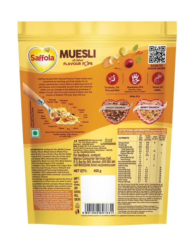 Start your morning with a royal touch of health and flavor with Saffola Muesli Kesar Crunch, now available at Nirogya Nepal. This 450g pack is a delightful blend of 5-grain nutrition (Oats, Wheat, Corn, Barley, and Rice) combined with the aromatic luxury of Kesar (Saffron) and crunchy pops. Designed for those who want a breakfast that is as tasty as it is nutritious, this muesli offers a perfect balance of crunch, aroma, and wholesome goodness.